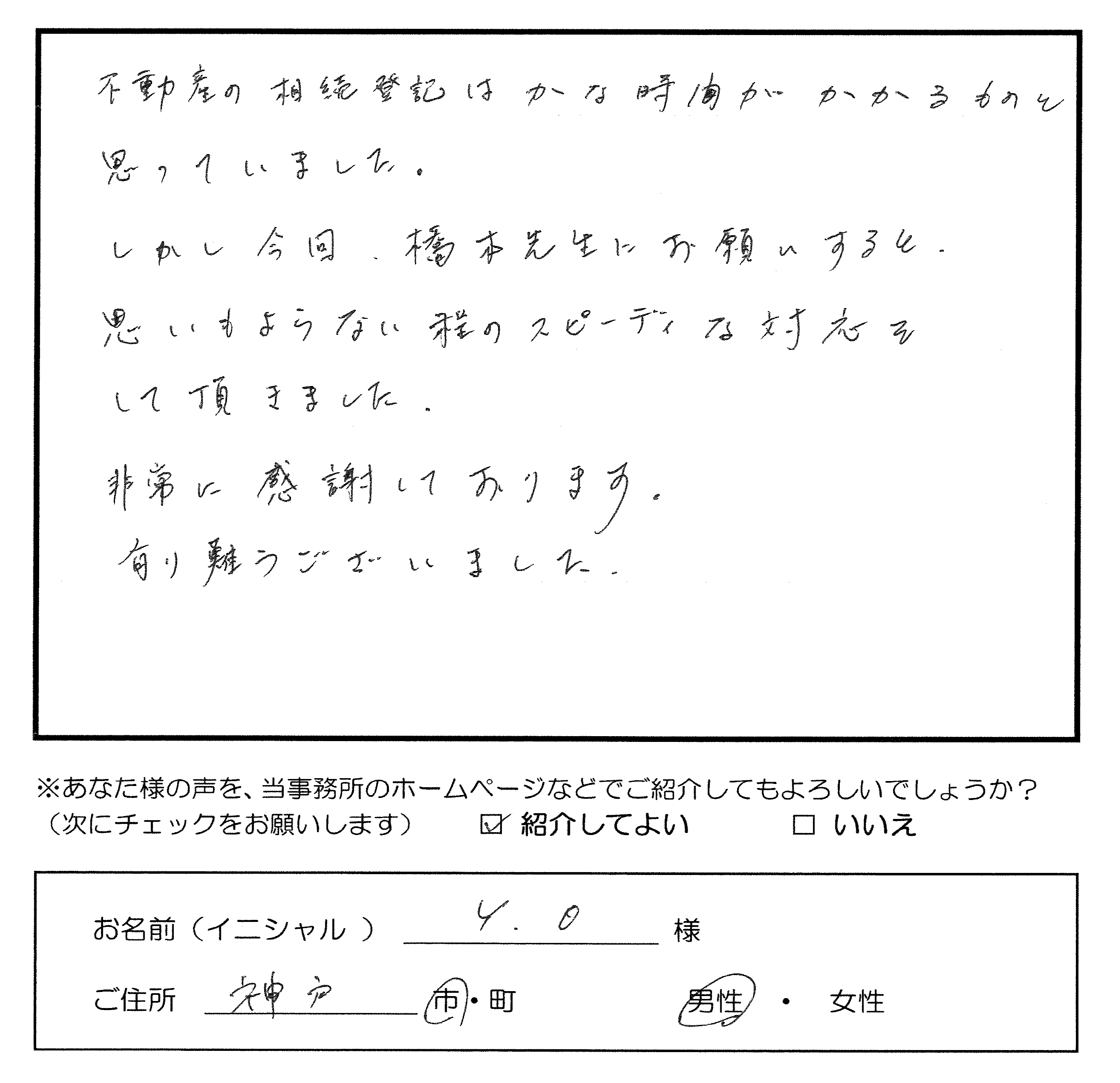 不動産の相続登記はかなり時間がかかるものと思っていました。しかし、今回、橋本先生にお願いすると思いもよらない程のスピーディな対応をして頂きました。非常に感謝しております。有り難うございました。(相続登記 名義変更) トップへもどる その他のお客様の声