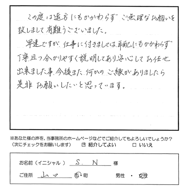 この度は遠方にもかかわらずご無理なお願いを致しまして有難うございました。早速ですが、仕事に付きましては年配にもかかわらず丁寧、且つ分かりやすく説明してあり、安心してお任せ出来ました事、今後また何かのご縁がありましたら是非お願いしたいと思ってます。 トップへもどる その他のお客様の声