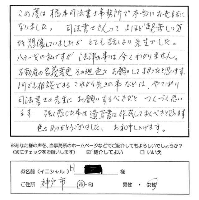 この度は橋本司法書士事務所で本当にお世話になりました。司法書士さんってよほど堅苦しい方かと想像していましたが、とても話しよい先生でした。八十一才の私ですが、法律の事は全くわかりません。不動産の名義変更その他色々お願いしてよかったと思います。なんでも相談できるこれから先の事などはやっぱり司法書士の先生にお願いするべきだとつくづく思います。強く感じた事は遺言書は作成しておくべきと思います。色々ありがとうございました。お礼申し上げます。 トップへもどる その他のお客様の声