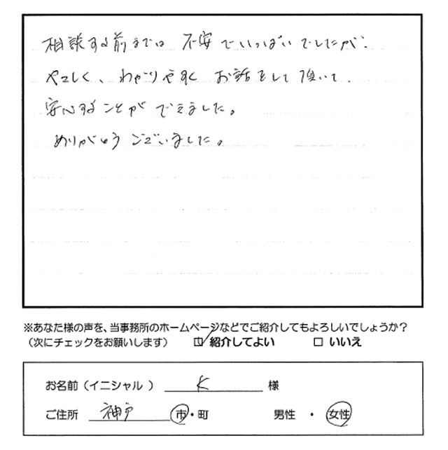 相談する前までは不安でいっぱいでしたが、やさしく、わかりやすくお話をして頂いて安心することができました。ありがとうございました。