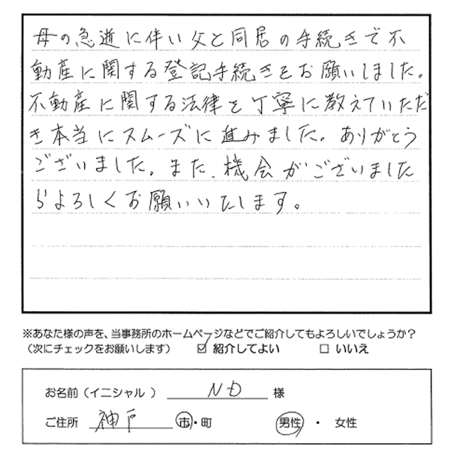 母の急逝に伴い父と同居の手続きで不動産に関する登記手続きをお願いしました。不動産に関する法律を丁寧に教えていただき本当にスムーズに進みました。ありがとうございました。また機会がございましたらよろしくお願いいたします。 トップへもどる その他のお客様の声