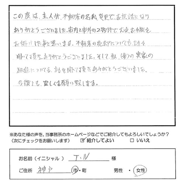 この度は主人が不動産の名義変更でお世話になりありがとうございました。市内と市外の2物件で大変お手数をお掛けした事と思います。不動産の売却についても話を聞いて頂きありがとうございました。そして、私(妻)の実家の相続についても話を聞いて頂きありがとうございました。今後とも宜しくお願い致します。 トップへもどる その他のお客様の声