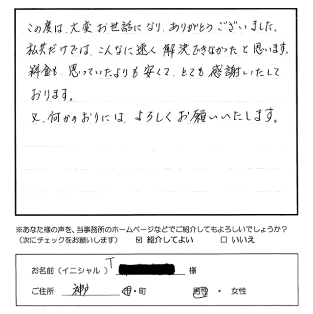 この度は大変お世話になりありがとうございました。私共だけでは、こんなに速く解決できなかったと思います。料金も思っていたよりも安くて、とても感謝いたしております。又、何かのおりにはよろしくお願いいたします。 トップへもどる その他のお客様の声