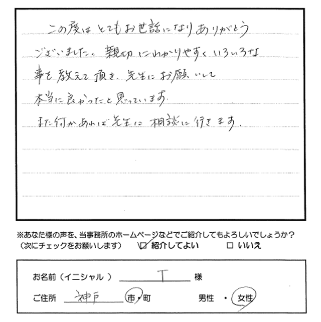 この度はとてもお世話になりありがとうございました。親切にわかりやすくいろいろな事を教えて頂き、先生にお願いして本当に良かったと思っています。また何かあれば先生に相談に行きます。 トップへもどる その他のお客様の声