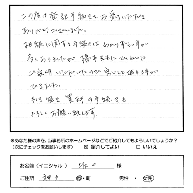 この度は登記手続きをお受けいただきありがとうございました。相続に関する手続きはわかりずらい事が多くありましたが、橋本先生にていねいにご説明いただいたので安心して進める事ができました。引き続き買却手続きもよろしくお願い致します。 トップへもどる その他のお客様の声