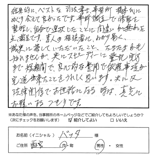 結果的にベストな司法書士事務所橋本氏にめぐり会えて良かったです。事前調査で情報を整理し自分で選択したことに間違いが無かった点、満足です。素人の相談者にわかり易く誠実に接していただいたこと、たまたまかも知れませんが実にスピーディに登記完了まで短期間で良心的な費用で依頼事項が完遂出来たことをうれしく思います。次に又法律関係でお世話になる時は真先にお願いするつもりです。 トップへもどる その他のお客様の声