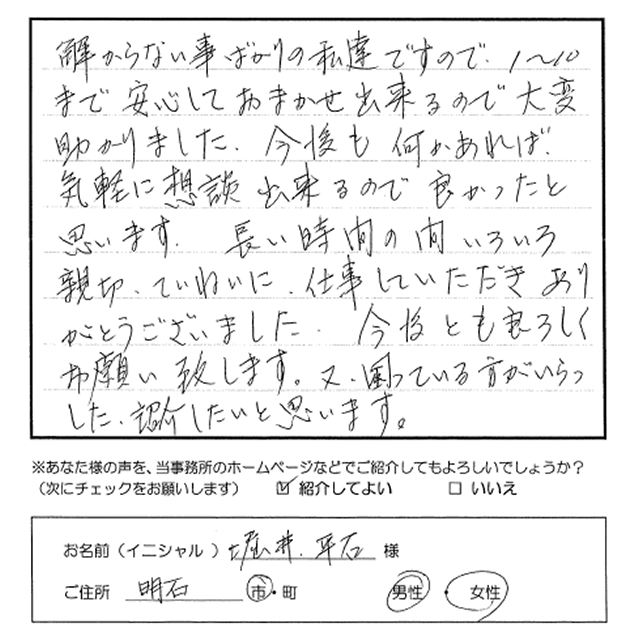 解らない事ばかりの私達ですので、1~10まで安心しておまかせ出来るので大変助かりました。今後も何かあれば気軽に想談出来るので良かったと思います。長い時間の間いろいろ親切、ていねいに、仕事をしていただきありがとうございました。今後とも宜しくお願い致します。又、困っている方がいらしたら紹介したいと思います。 トップへもどる その他のお客様の声