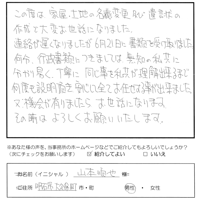 この度は家屋・土地の名義変更及び遺言状の作成で大変お世話になりました。 連絡が遅くなりましたが6月21日に書類を受け取りました。 何分、行政書類につきましては、無知の私共に分かり易く、丁寧に、同じ事を私共が理解出来るまで何度も説明頂き安心して全てお任せする事が出来ました。 又、機会が有りましたらお世話になります。 その時はよろしくお願いいたします。 トップへもどる その他のお客様の声