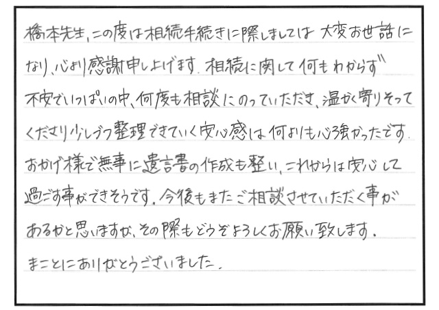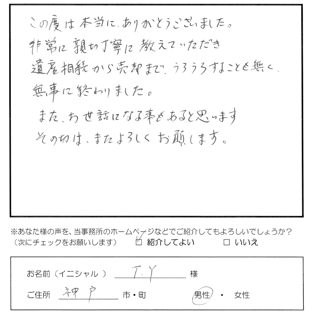 この度は本当にありがとうございました。 非常に親切丁寧に教えていただき、 遺産相続から売却まで、うろうろすることも無く、無事に終わりました。 またお世話になる事もあると思います。 その節は、またよろしくお願いします。 トップへもどる その他のお客様の声