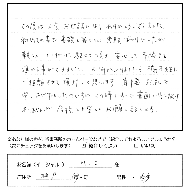 この度は大変お世話になりありがとうございました。 初めての事で書類を書くのに失敗ばかりでしたが、親切丁寧に教えて頂き、安心して手続きを進める事ができました。又何かありましたら、橋本先生にご相談させて頂きたいと思います。直接お礼を申し上げたかったのですが、この時ですので書面で申し訳ありませんが、今後とも宜しくお願い致します。 トップへもどる その他のお客様の声