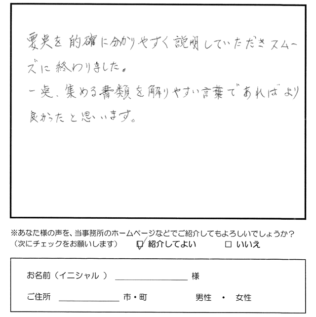 要点を的確に分かりやすく説明していただきスムーズに終わりました。 一点、集める書類を解りやすい言葉であればより良かったと思います。 【事務所からのコメント】 ご意見ありがとうございました。 必要書類案内をよりわかりやすく改善させていただきました。 トップへもどる その他のお客様の声