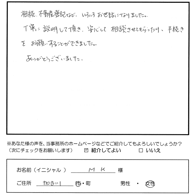 丁寧に説明して頂き、安心して相談させてもらったり、手続きをお願いする事ができました。