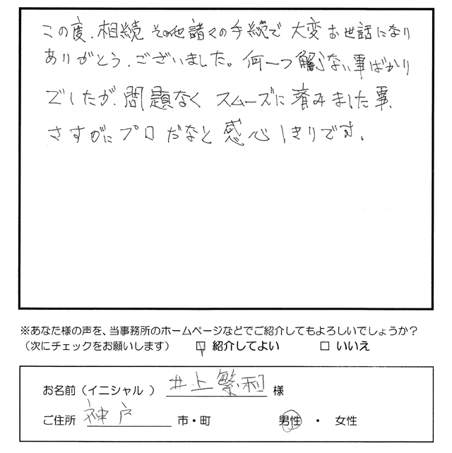 この度、相続その他諸々の手続で大変お世話になりありがとうございました。 何一つ解らない事ばかりでしたが、問題なくスムーズに済みました事、さすがにプロだなと感心しきりです。 トップへもどる その他のお客様の声