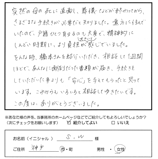 突然の母の死に直面し、葬儀などが終わってから、さまざまな手続きが必要だと知りました。遠方に住んでいたので、戸籍ひとつ取るのも大変で、精神的にしんどい時期に、より負担が大きいと感じていました。 そんな時、橋本さんんを紹介いただき、相談して1週間ほどで、あんなに面倒だった書類が届き、手続きをしていただだいた事よりも「安心」を与えてもらったと思っています。 これからもいろいろと相談していきたいです。 この度は、ありがとうございました。 トップへもどる その他のお客様の声
