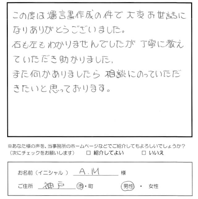 この度は遺言書作成の件で大変お世話になりありがとうございました。 右も左もわかりませんでしたが丁寧に教えていただき助かりました。 また何かありましたら相談に乗っていただきたいと思っております。 トップへもどる その他のお客様の声