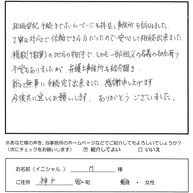 相続登記手続きでホームページを拝見し事務所を訪れました。 丁寧な対応で信頼できる方だったので安心して相談出来ました。 複数(十数筆)の地方の物件で、しかも一部祖父の名義のものも有り不安もありましたが、 弁護士事務所も紹介頂き、総て無事に手続完了出来ました。感謝申し上げます。 今後共に宜しくお願いします。ありがとうございました。 トップへもどる その他のお客様の声