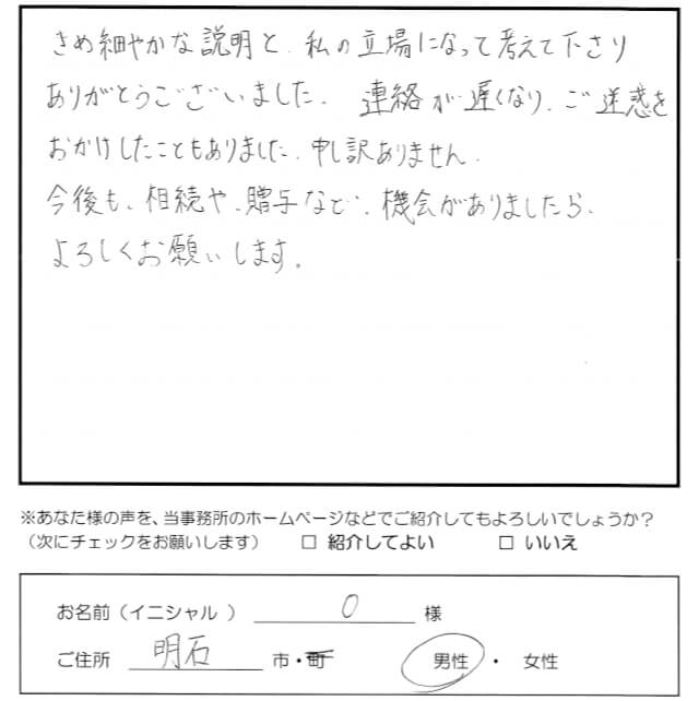 きめ細やかな説明と私の立場になって考えて下さりありがとうございました。連絡が遅くなりご迷惑をおかけしたこともありました。申し訳ありません。今後も、相続や贈与など、機会がありましたらよろしくお願いします。 トップへもどる その他のお客様の声