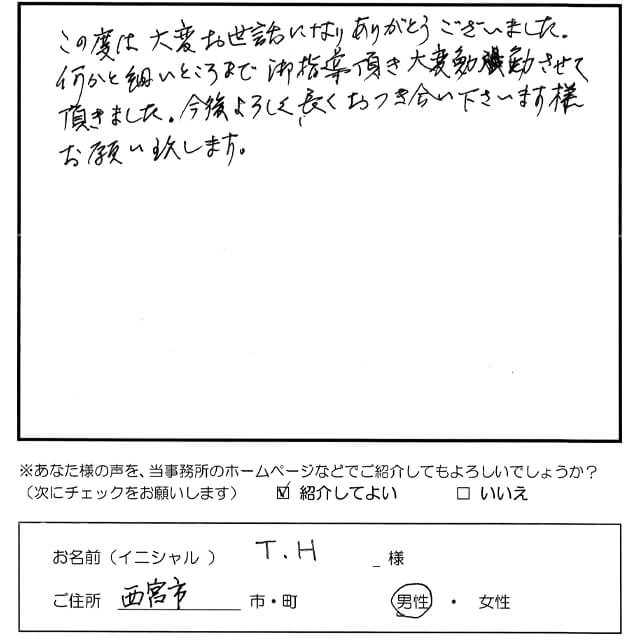 この度は大変お世話になりありがとうございました。 何かと細かいところまで御指導頂き、大変勉強させて頂きました。 今後よろしく長くお付き合い下さいます様お願い致します。 トップへもどる その他のお客様の声