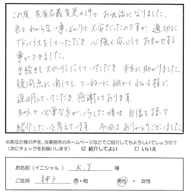 この度、共有名義変更の件でお世話になりました。 色々わからない事ばかりで不安だったのですが、適切にアドバイスをしていただき、心強く安心しておまかせすることができました。 手続きもスピーディにしていただき、本当に助かりました。 疑問点に関しても、ていねいに細かくわかるように説明していただき、感謝しております。 知人で必要な方がいらした時は自信をもって紹介したいと考えています。 今回はありがとうございました。 トップへもどる その他のお客様の声