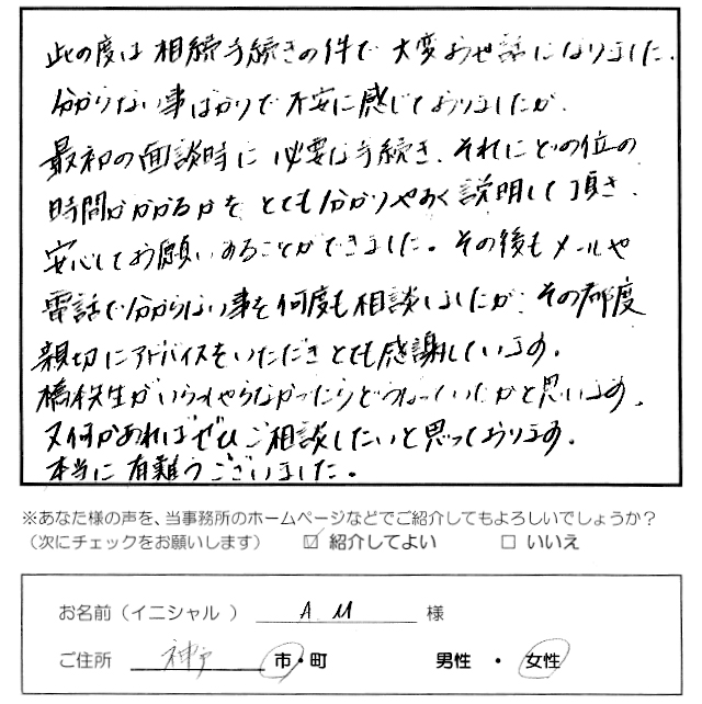 此の度は相続手続の件で大変お世話になりました。 分からない事ばかりで不安に感じておりましたが、最初の面談時に必要な手続き、それにどの位の時間がかかるかを、とても分かりやすく説明して頂き、安心してお願いすることができました。 その後もメールや電話で分からない事を何度も相談しましたが、その都度親切にアドバイスをいただき、とても感謝しています。 橋本先生がいらっしゃらなかったらどうなっていたかと思います。 又何かあればぜひご相談したいと思っております。 本当に有難うございました。 トップへもどる その他のお客様の声