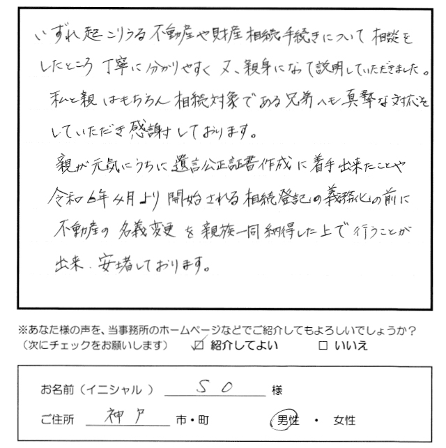 いずれ起こりうる不動産や財産相続手続きについて相談をしたところ、丁寧に分かりやすく又、親身になって説明していただきました。 私と親はもちろん相続対象である兄弟へも真摯な対応をしていただき感謝しております。 親が元気なうちに遺言公正証書作成に着手出来たことや、令和6年4月より開始される相続登記の義務化の前に、不動産の名義変更を親族一同納得した上で行うことが出来、安堵しております。 トップへもどる その他のお客様の声
