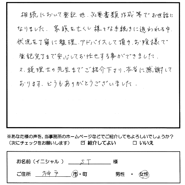 相続において登記他、必要書類作成等でお世話になりました。 家族を亡くし様々な手続きに追われる中、状況を丁寧に整理、アドバイスして頂き、お陰様で登記完了まで安心してお任せする事ができました。 又、税理士の先生までご紹介下さり、本当に感謝しております。 どうもありがとうございました。 トップへもどる その他のお客様の声