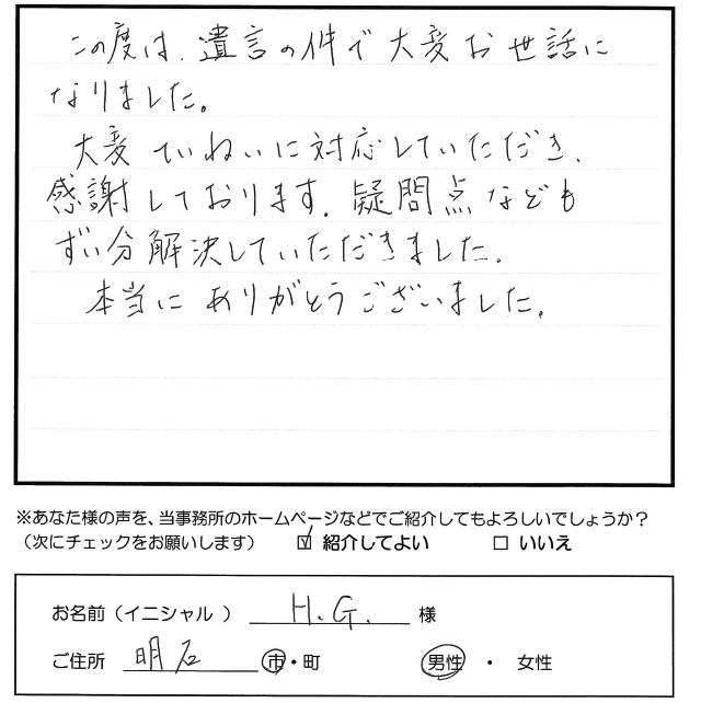 この度は、遺言の件で大変お世話になりました。 大変ていねいに対応していただき、感謝しております。 疑問点なども随分解決していただきました。 本当にありがとうございました。 トップへもどる その他のお客様の声