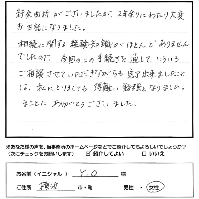 紆余曲折がございましたが、2年余りにわたり大変お世話になりました。 相続に関する経験・知識がほとんどありませんでしたので、今回のこの手続きを通して、いろいろご相談させていただきながらも完了出来ましたことは、私にとりましても得難い勉強となりました。 まことにありがとうございました。 トップへもどる その他のお客様の声