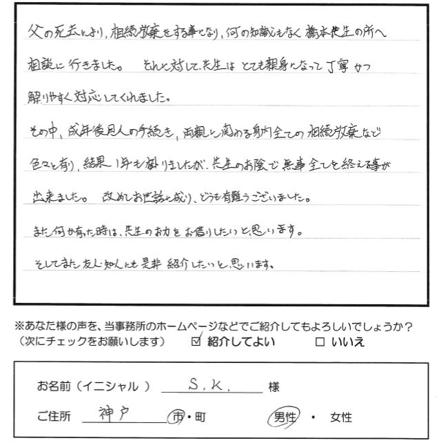 父の死去により、相続放棄をする事になり、何の知識もなく橋本先生の所へ 相談に行きました。 それに対して、先生はとても親身になって丁寧かつ、解りやすく対応してくれました。 その中、成年後見人の手続き、両親に関わる身内全ての相続放棄など色々と有り、結果1年も掛りましたが、先生のお陰で無事全てを終える事が出来ました。 改めてお世話に成り、どうも有難うございました。 また何か有った時は、先生のお力をお借りしたいと思います。 そしてまた、友人知人にも是非紹介したいと思います。 トップへもどる その他のお客様の声