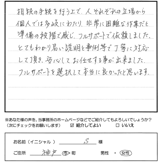 相続の手続を行う上で、人それぞれの立場から個人では多岐にわたり、非常に困難な作業だと準備の段階で感じ、フルサポートで依頼しました。 とてもわかり易い説明と事例等で丁寧に対応 して頂き、安心してお任せする事が出来ました。 フルサポートを選択して本当に良かったと思います。 トップへもどる その他のお客様の声