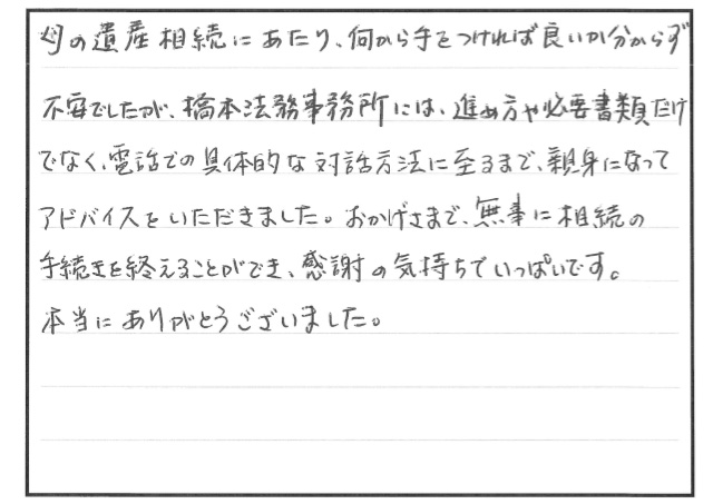当初は信託の制度を活用した相続を検討していました。 そこで税理士の方から信託にも詳しい橋本先生をご紹介いただきました。 信託活用の留意点等をいろいろと教えていただきま した。 結局、信託は使わず相続人共有での相続 としました。 1人が海外在住でしたがZOOMの活用等により円滑に対応していただきました。 安心してお任せすることができました。 ありがとうございました。 トップへもどる その他のお客様の声