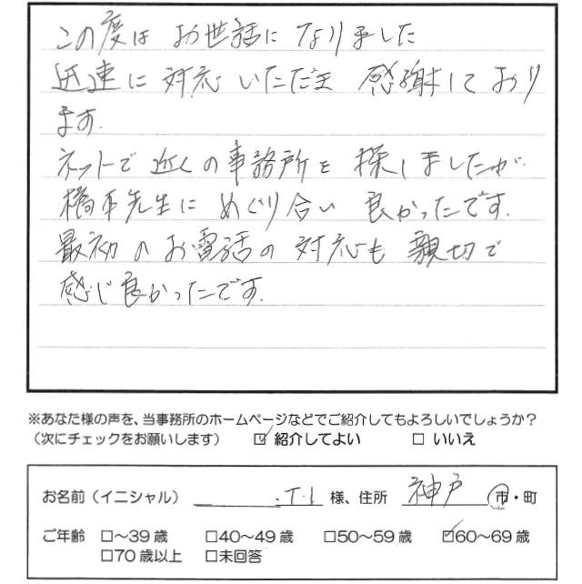 この度はお世話になりました 。 迅速に対応いただき感謝しております。 ネットで近くの事務所を探しましたが 橋本先生にめぐり合い良かったです。 最初のお電話の対応も親切で、感じ良かったです。 トップへもどる その他のお客様の声
