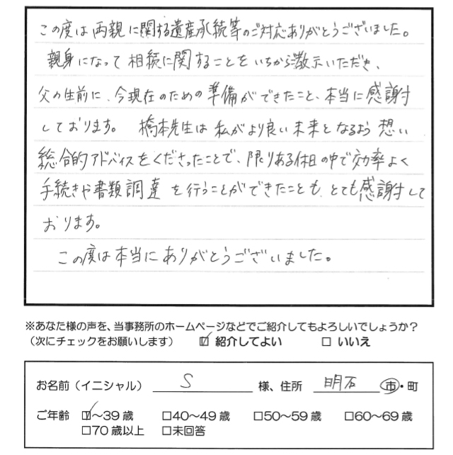 この度は両親に関する遺産承続等のご対応ありがとうございました。 親身になって相続に関することをいちから教示いただき、 父の生前に、今現在のための準備ができたこと、本当に感謝しております。 橋本先生は私がより良い未来となるよう想い総合的アドバイスをくださったことで、 限りある休日の中で効率よく手続きや書類調達を行うことができたことも、 とても感謝して おります。 この度は本当にありがとうございました。 トップへもどる その他のお客様の声