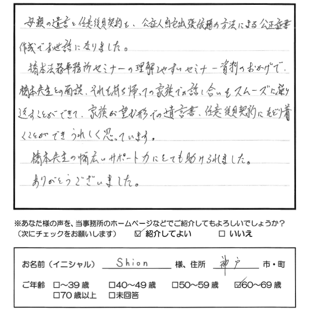 母親の遺言と任意後見契約を、公証人自宅出張依頼の方法による公正証書作成でお世話になりました。 橋本法務事務所セミナーの理解しやすいセミナー資料のおかげで、橋本先生との面談、それを持ち帰っての家族での話し合いをスムーズに繰り返すことができて、家族が望む形での遺言書、任意後見契約にたどり着くことができうれしく思っています。 橋本先生の幅広いサポート力にとても助けられました。 ありがとうございました。 トップへもどる その他のお客様の声
